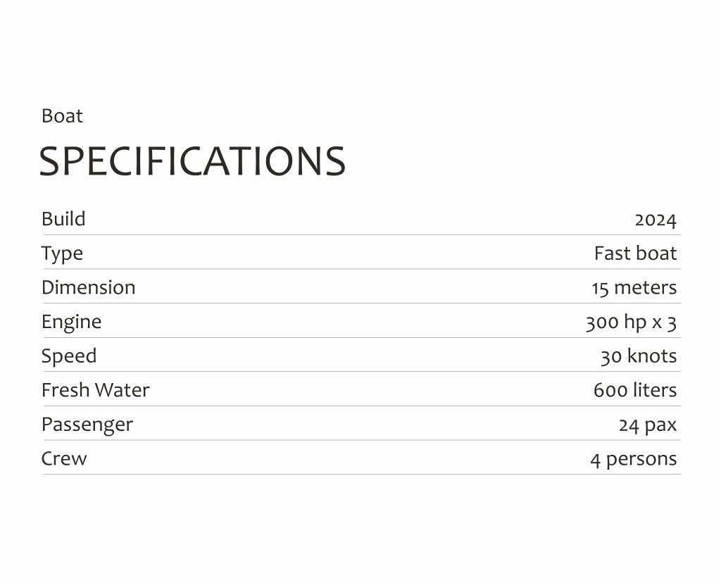 Built in 2025, this fast boat is designed for travelers who want a smooth and effortless way to explore Komodo. With space for up to twenty guests, it offers two decks, powerful triple engines and essential safety equipment. Guests can enjoy air conditioning, complete snorkeling gear and refreshments.